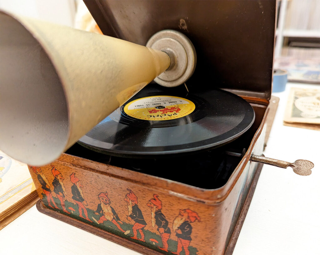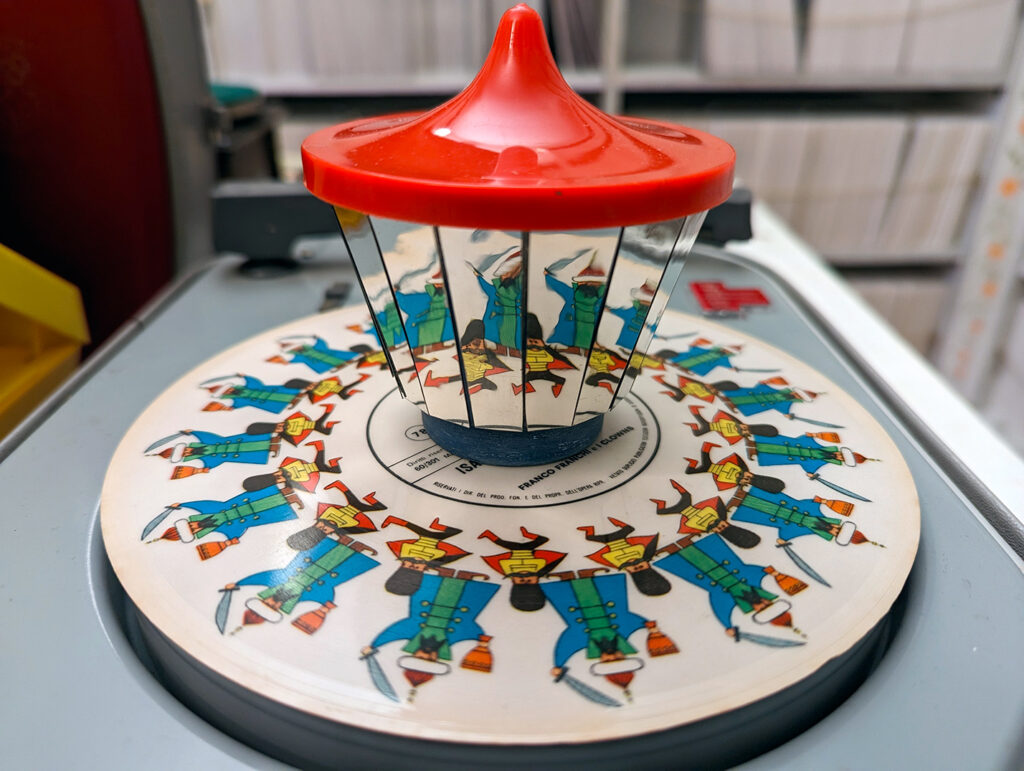 Da questo bizzarro ma promettente esordio i dischi per bambini ebbero una grande espansione sul mercato del suono inciso con tantissime etichette spesso anche storiche (per citarne alcune Decca, Columbia, RCA Victor) che producevano corpose collezioni di dischi (alcune arrivavano a qualche centinaia di titoli) destinati a dei giovanissimi consumatori. I contenuti erano decisamente vari; per i più piccoli si partiva da dei semplici suoni ritmici, piccole filastrocche, piccole canzoncine orecchiabili e ripetitive, brevi fiabe; mentre per i bambini un po’ più grandi si incidevano favole articolate, canzoni su treni e cowboys, storie buffe, storie avventurose per adolescenti, canzoni, lezioni scolastiche, lezioni di lingua, guide su buone abitudini e buone maniere e tanto altro. Alcuni dischi venivano poi venduti assieme a dei gadget per migliorare l’esperienza dell’ascolto aggiungendo effetti scenici come per esempio il “disco animato”, un sistema che integrava la lettura di un disco a delle immagini in movimento generate da un prassinoscopio. L’americana “Red Raven” o l’italianissimo “Moviton” dell’azienda milanese Mamil, vendevano valigette contenenti alcuni dischi e un prisma composto da 16 specchi posizionati a 45° disposti in modo da riflettere una sequenza di immagini verso l’ascoltatore dando a lui la sensazione di vedere le figure animarsi.